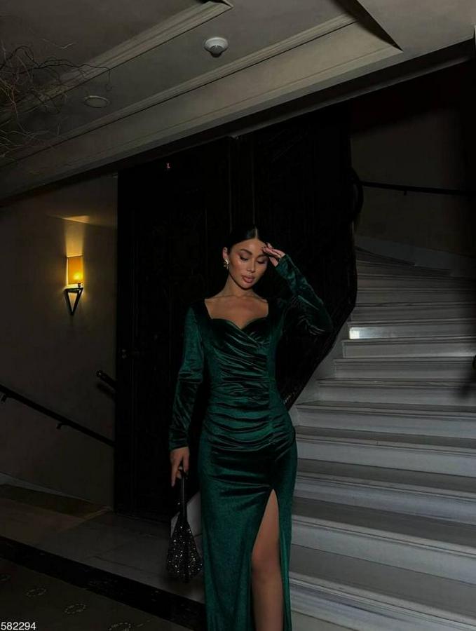 Kadın Kadife Kumaş Kalp Yaka Yırtmaç Detaylı Maxi Boy Elbise