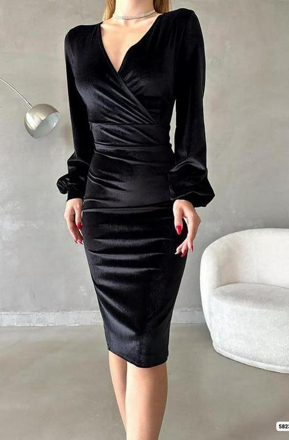 Kadın Kadife Kumaş Kruvaze Yaka Balon Kol Ve Yırtmaç Detaylı Midi Boy Elbise