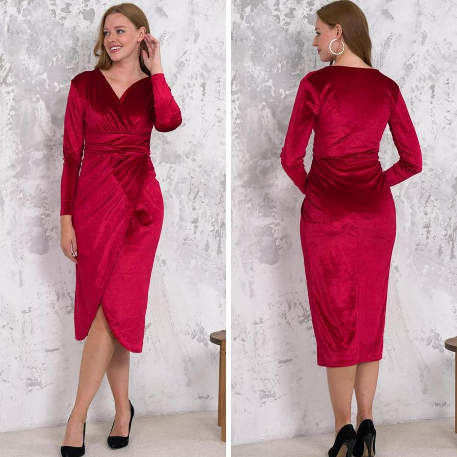 Kadın Kadife Kumaş V Yaka Uzun Kollu Midi Boy Elbise