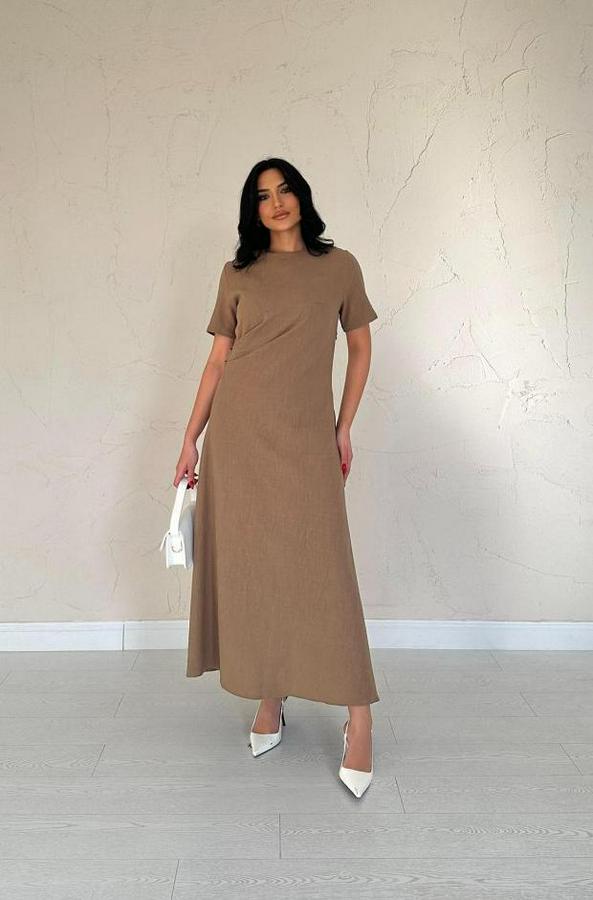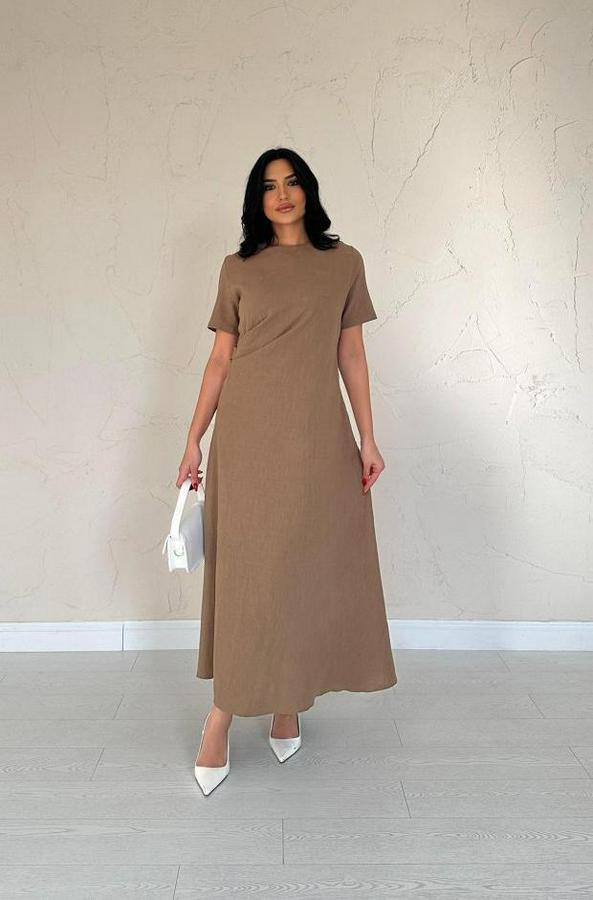 AnasayfaTüm ÜrünlerElbiseKahverengi Pileli Bisiklet Yaka Elbise