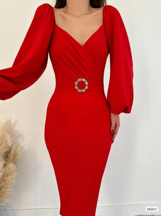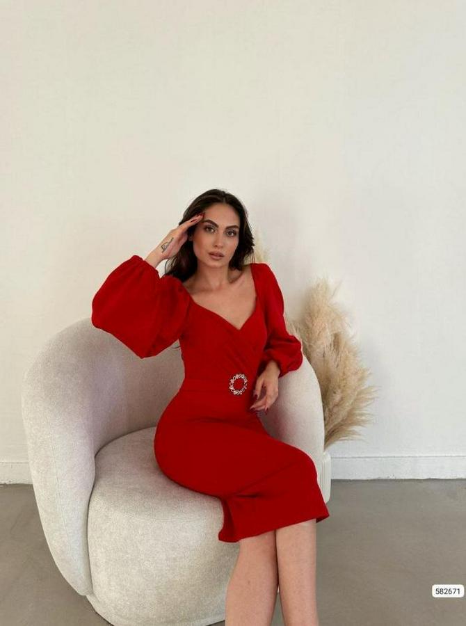 Kadın Kalp Yaka Sırt Dekolteli Kemer Toka Detay Midi Boy Elbise
