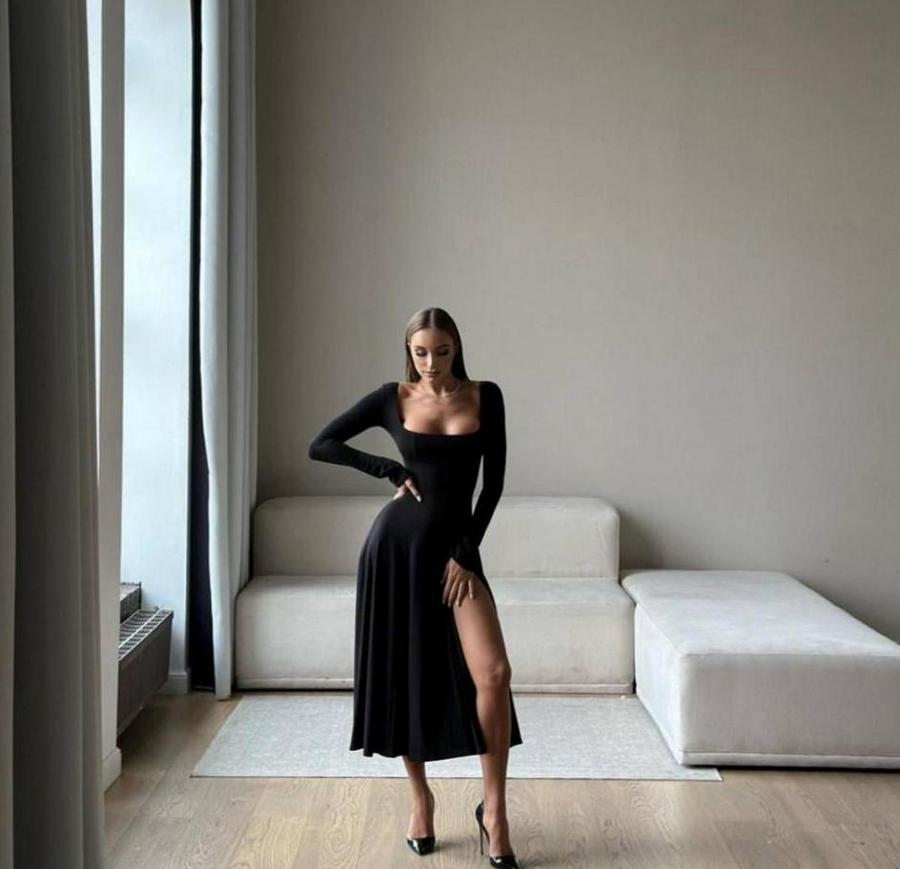 Kare Yaka Derin Göğüs Ve Bacak Dekolteli Midi Boy Elbise