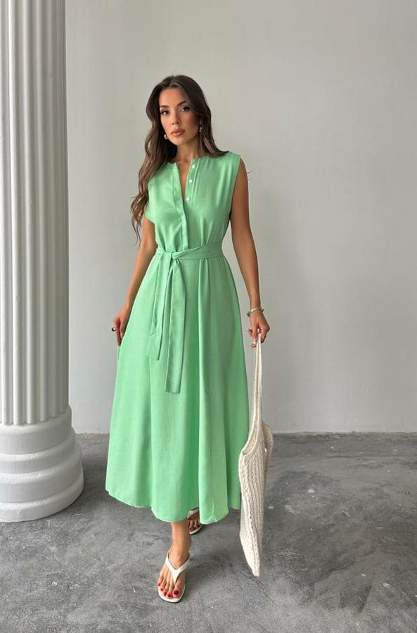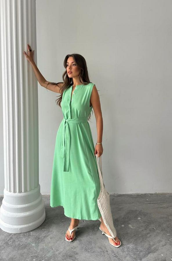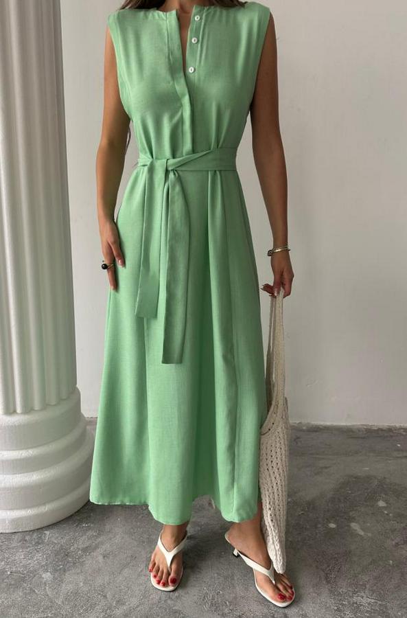 KETEN ELBİSE KOLSUZ BEL BAĞLAMALI MAXİ ELBİSE - Yeşil