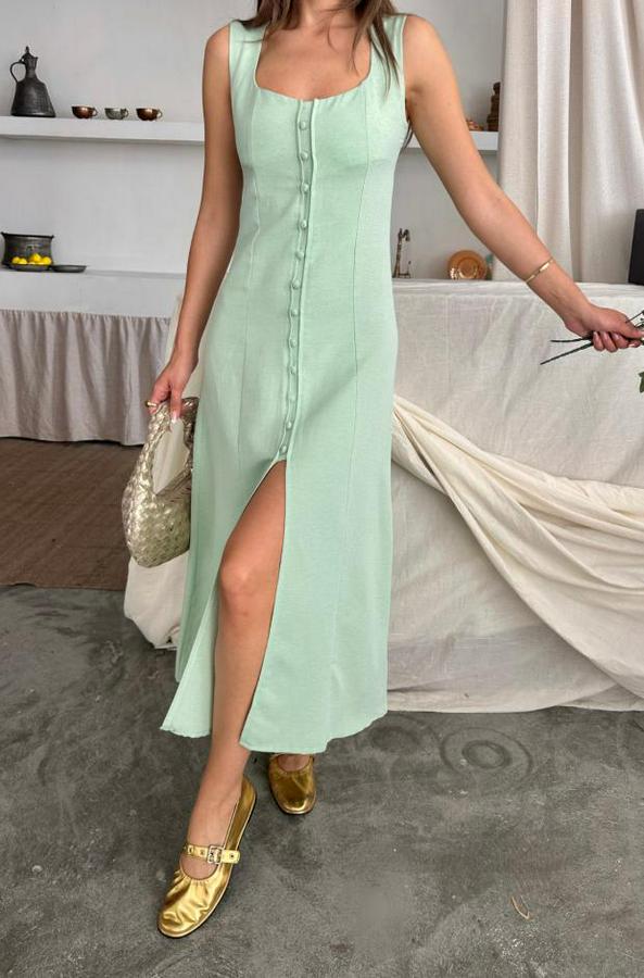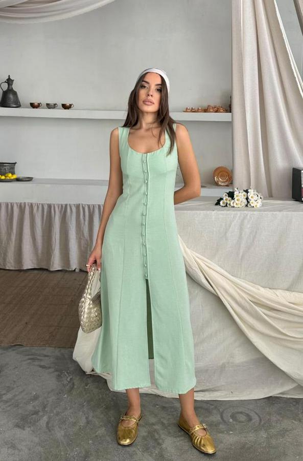 KETEN KOLSUZ KARE YAKA DÜĞME DETAYLI ELBİSE - Mint