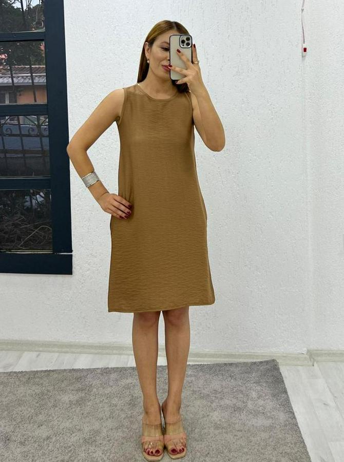 Kadın Keten Kumaş Cep Detaylı Sıfır Kol Elbise