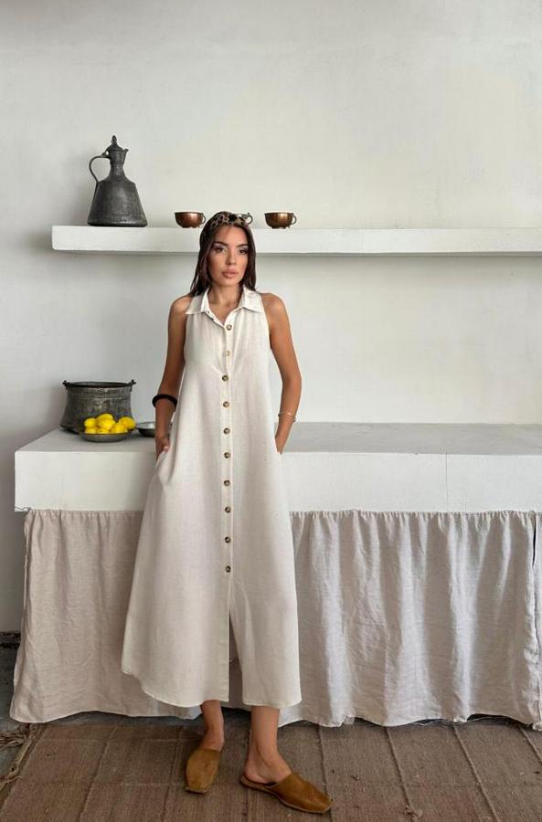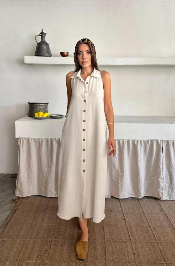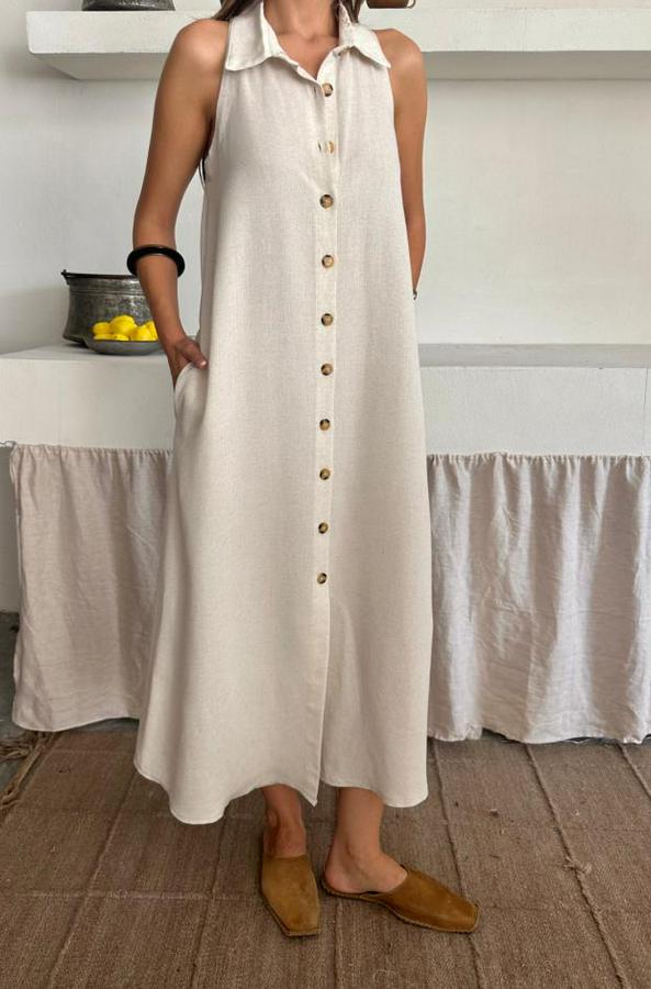 Keten Önden Düğmeli Kolsuz Gömlek Yaka Elbise