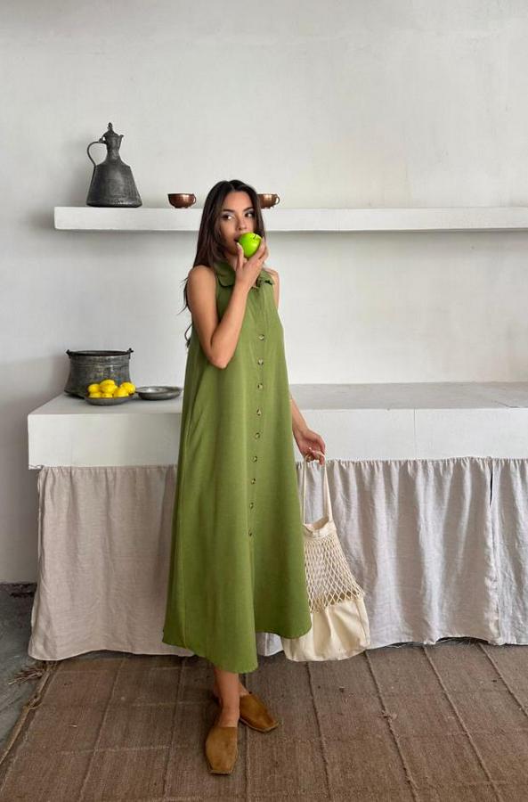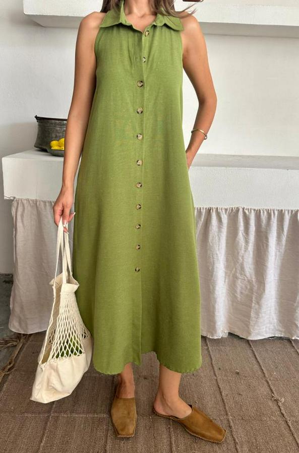 KETEN ÖNDEN DÜĞMELİ KOLSUZ GÖMLEK YAKA ELBİSE - Yağ Yeşili