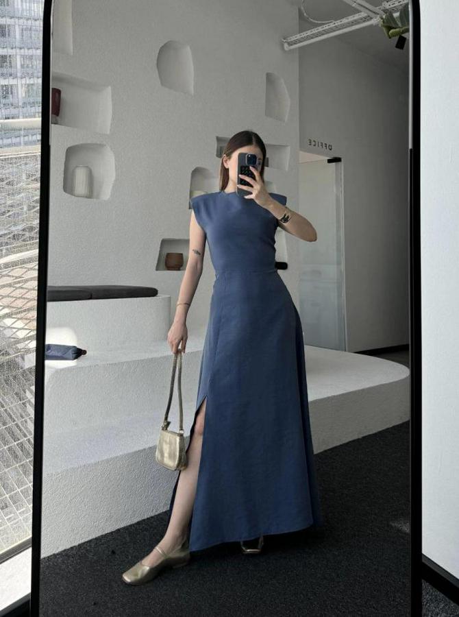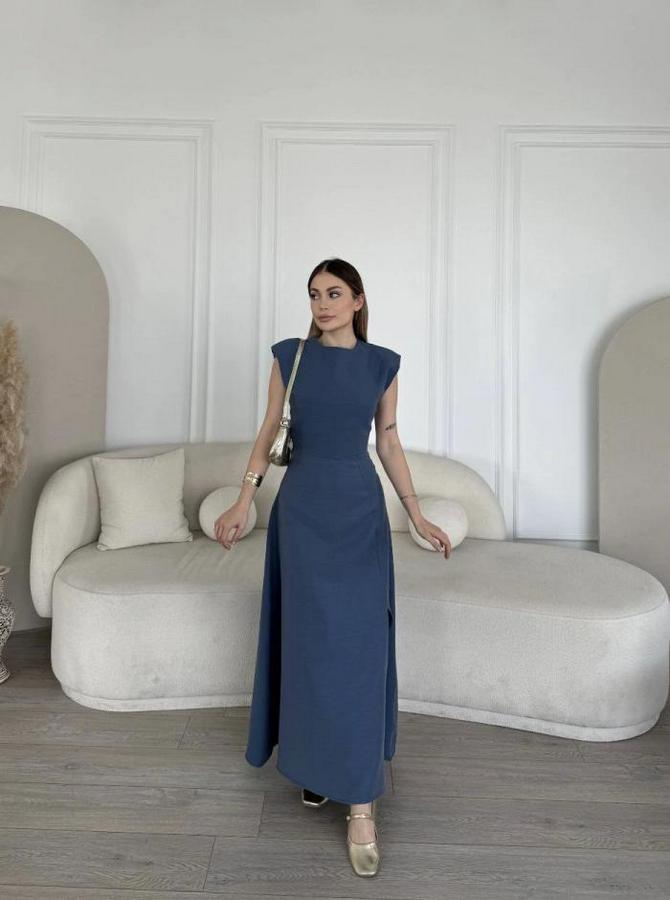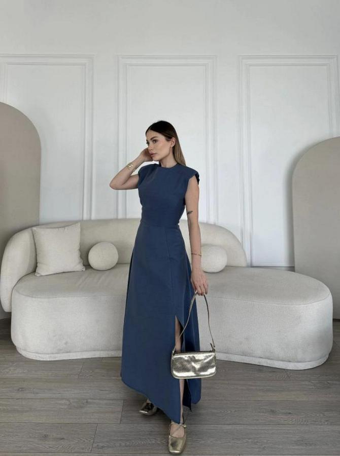 Keten Yandan Yırtmaçlı Uzun Sıfır Kolsuz Elbise - Mavi