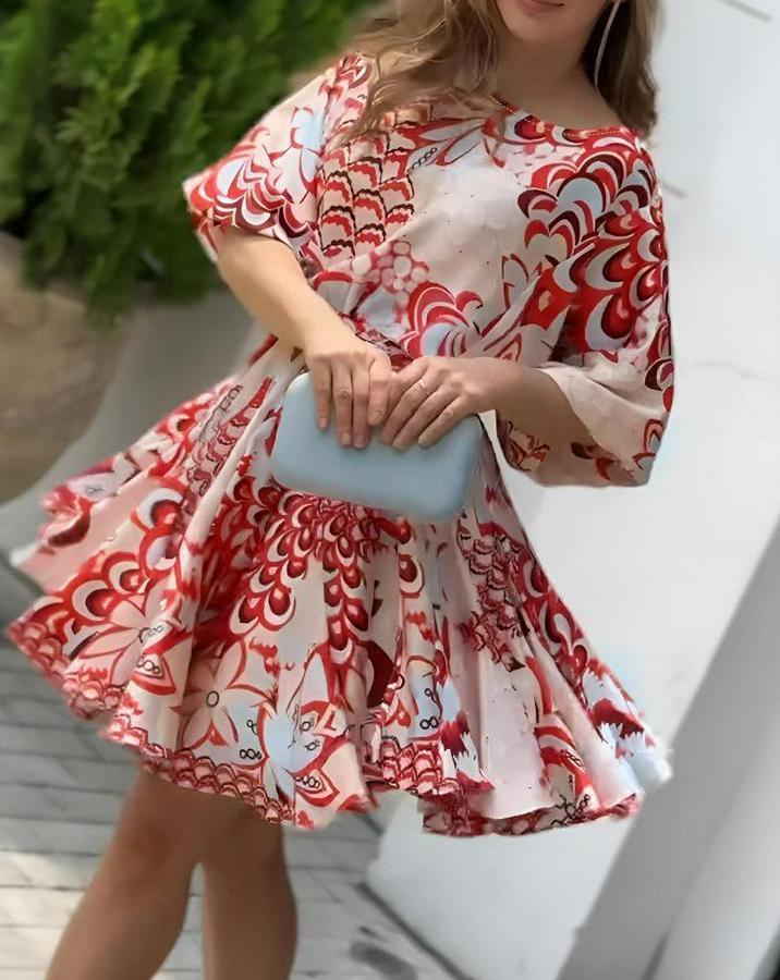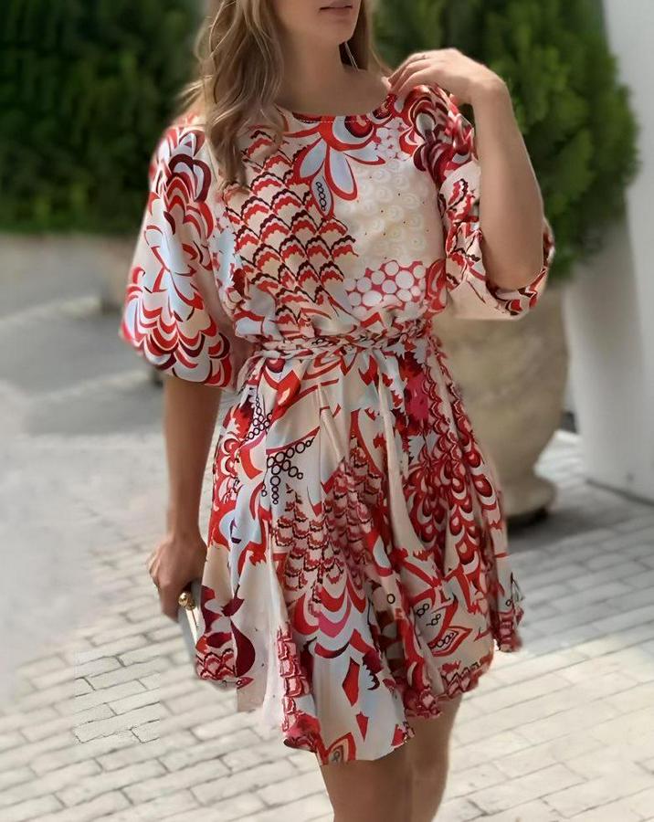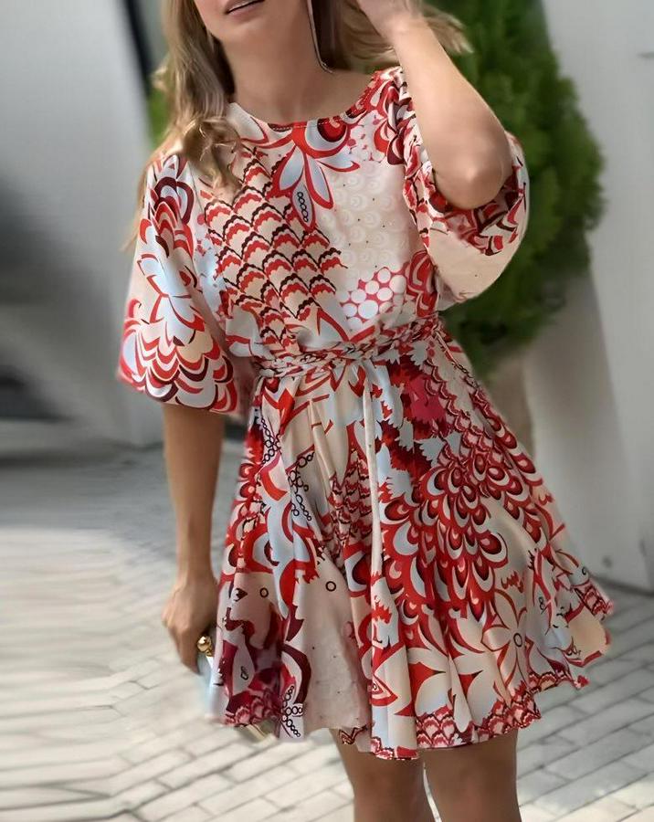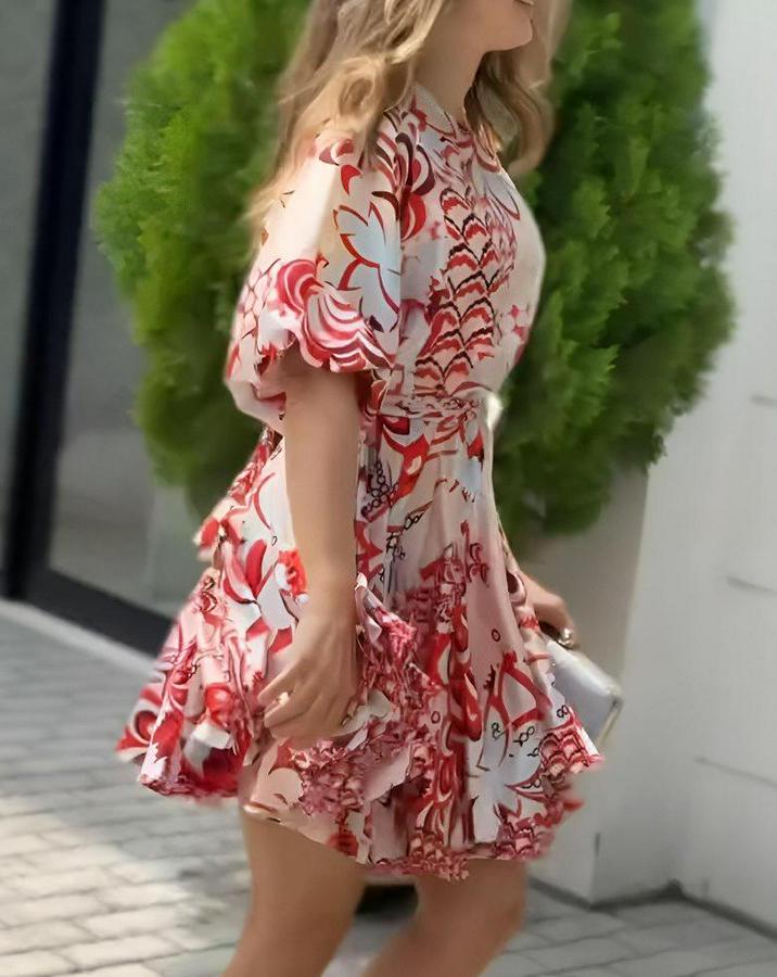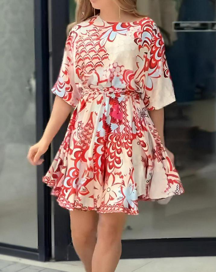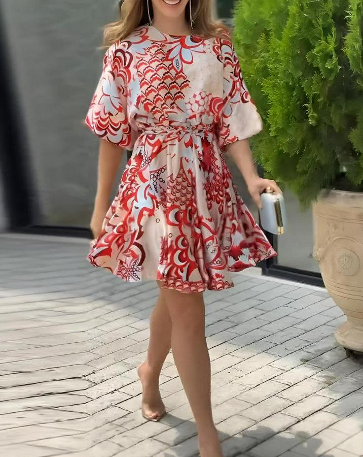 Kadın Kısa Balon Kollu Yuvarlak Yakalı Pileli Desenli Mini Elbise