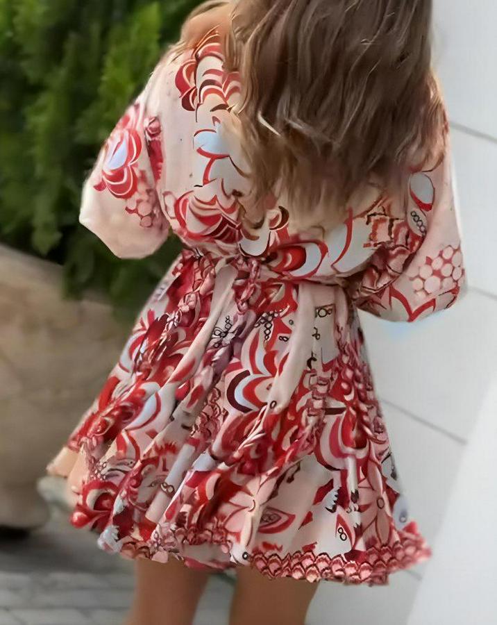 Kısa Balon Kollu Yuvarlak Yakalı Pileli Desenli Mini Elbise