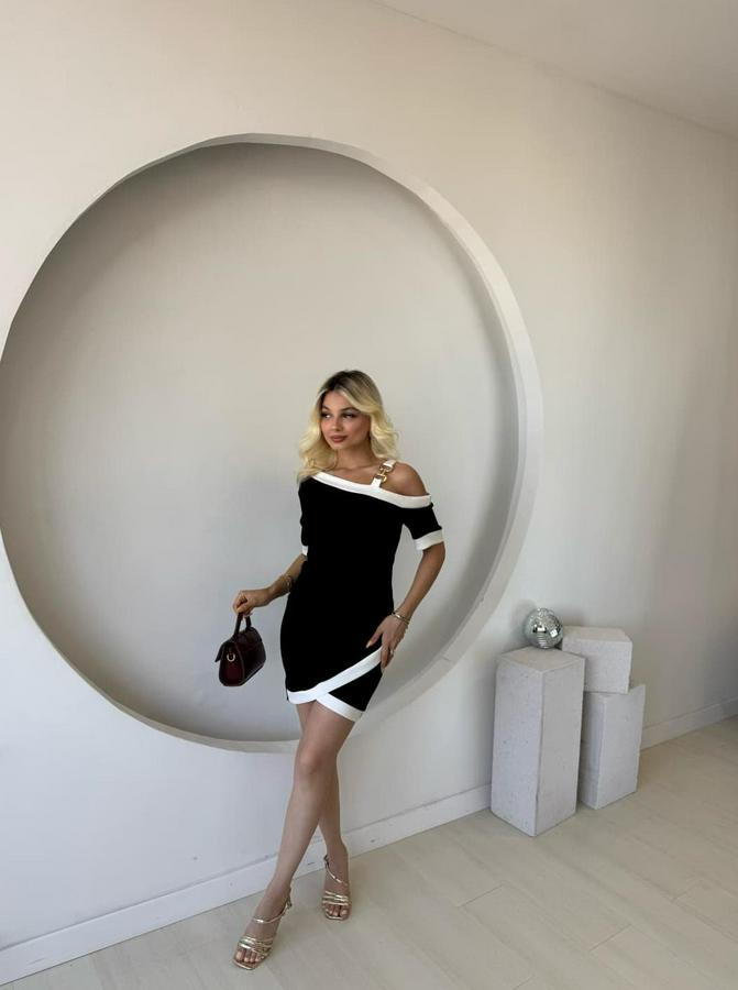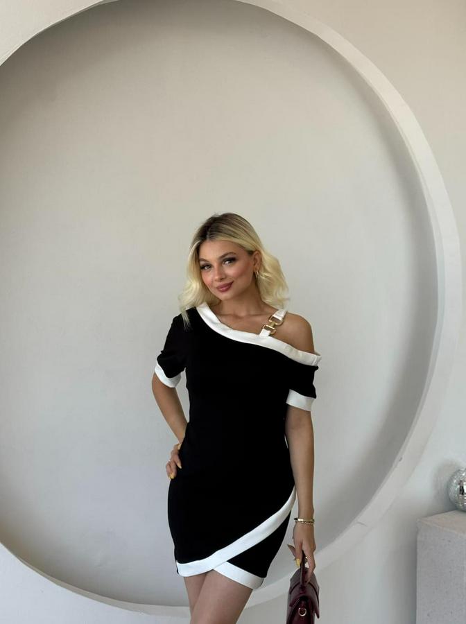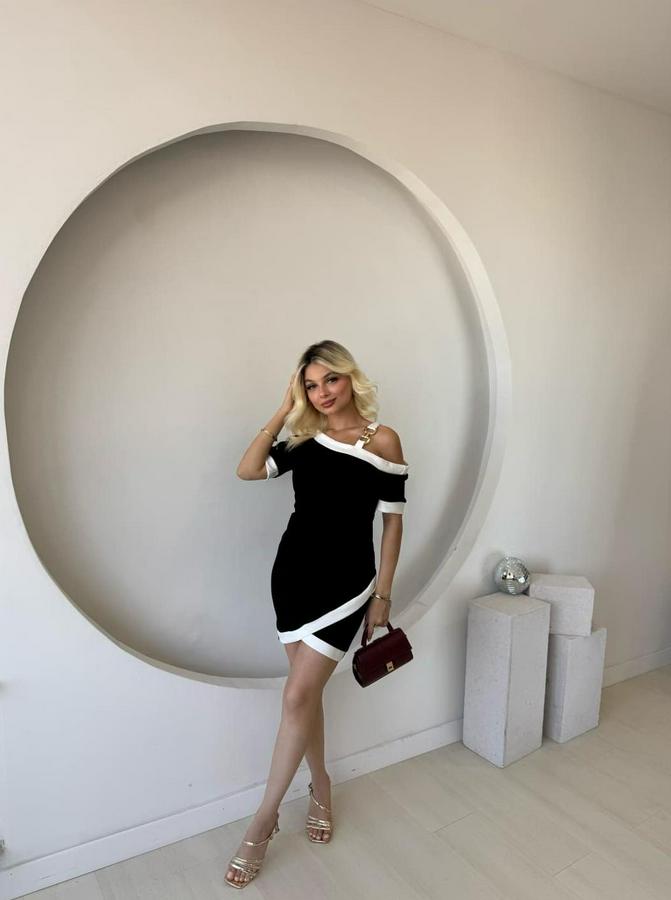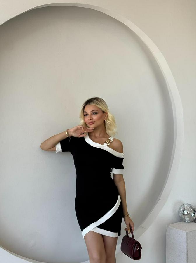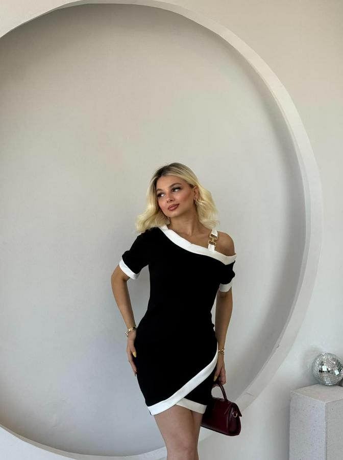 AnasayfaTüm ÜrünlerElbiseKısa Kollu Asimetrik Kesim Yaka Şerit Ve Aksesuar Detaylı Modal Elbise