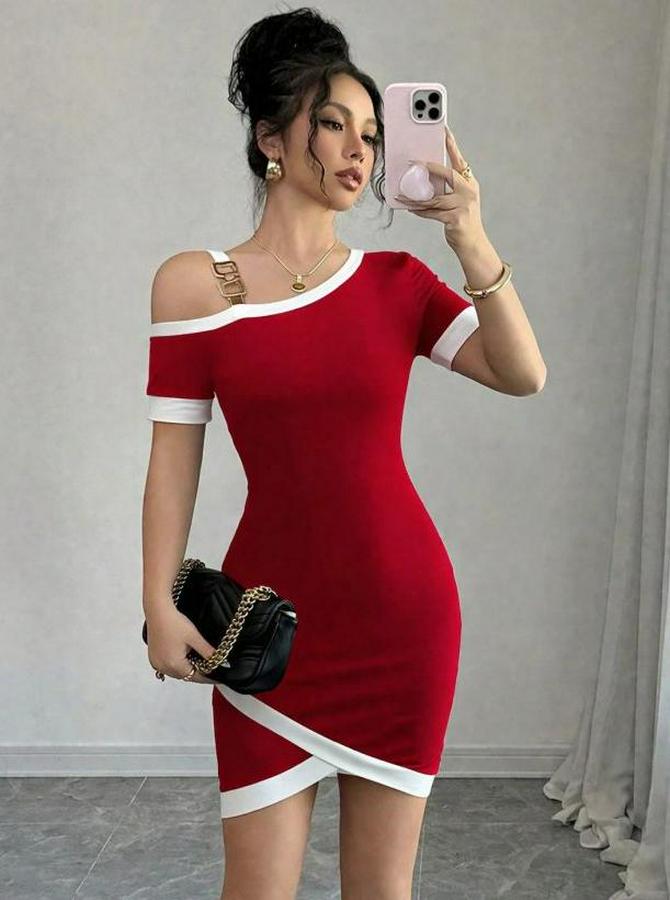 Kadın Kısa Kollu Asimetrik Kesim Yaka şerit Ve Aksesuar Detaylı Modal Elbise