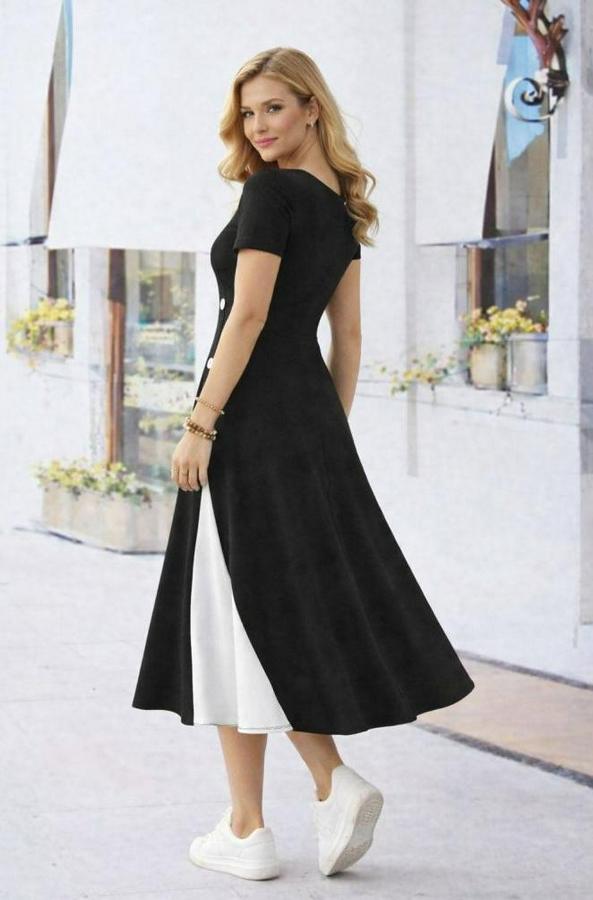 Kısa Kollu Asimetrik Yakalı Düğme Detaylı Midi Viskon Elbise