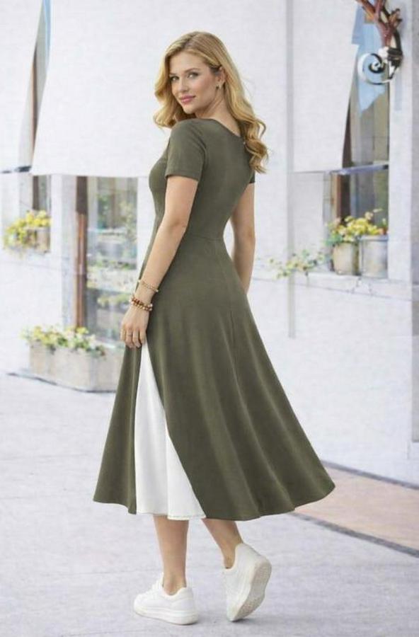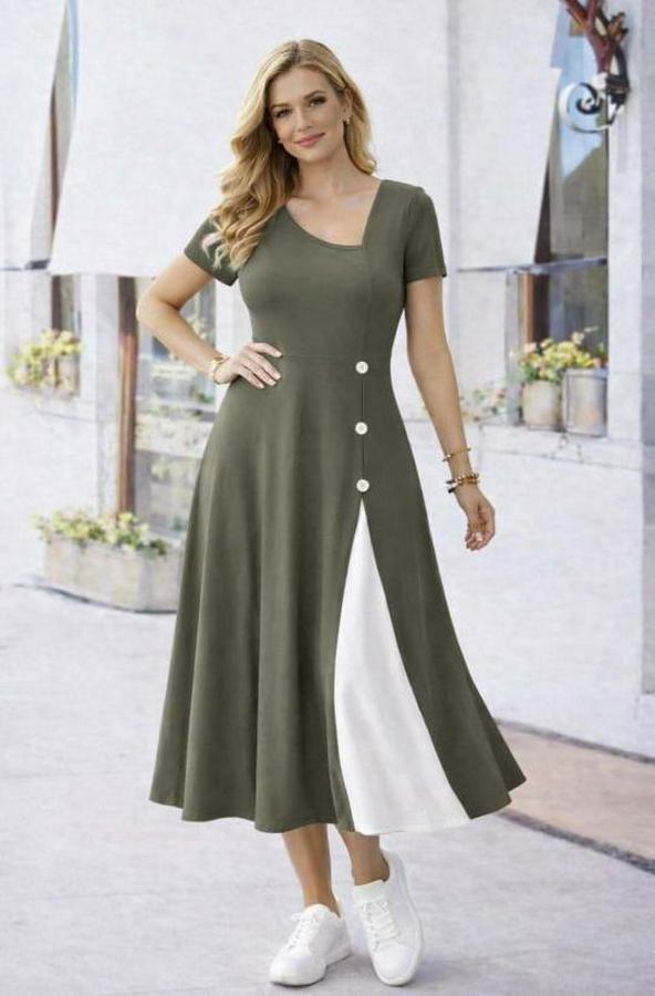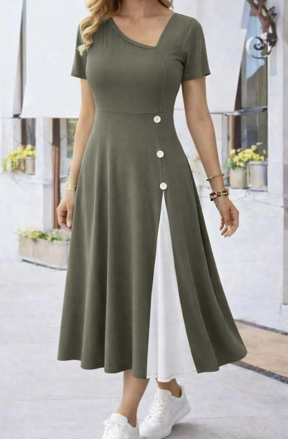 Kısa Kollu Asimetrik Yakalı Düğme Detaylı Midi Viskon Elbise