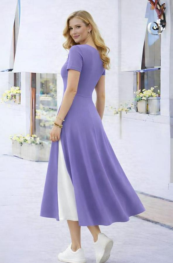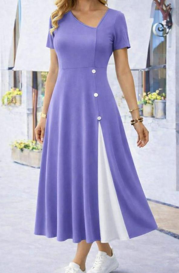 Kısa Kollu Asimetrik Yakalı Düğme Detaylı Midi Viskon Elbise