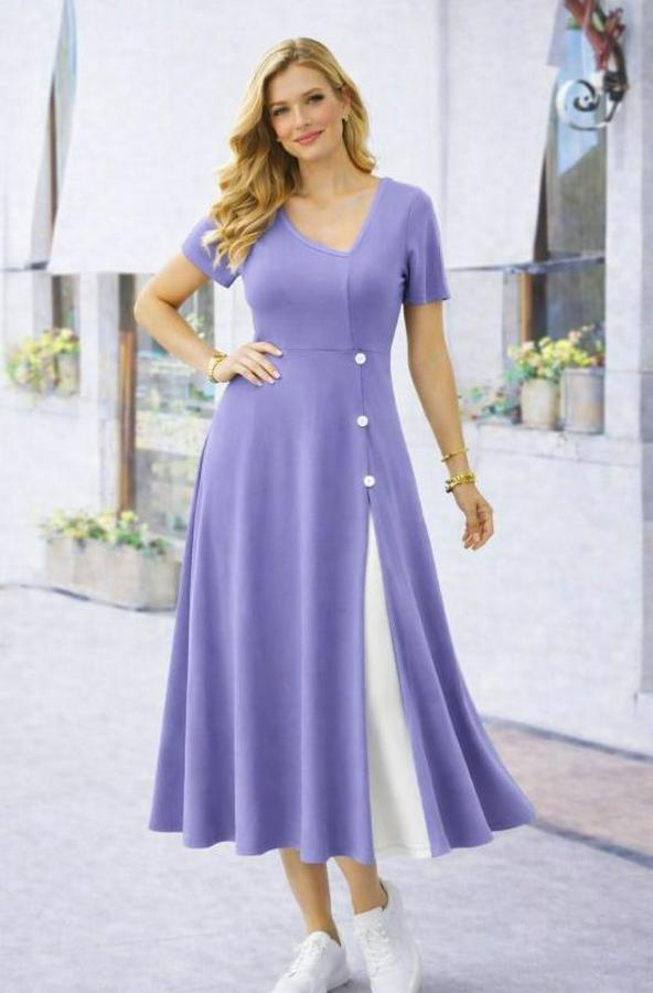 Kadın Kısa Kollu Asimetrik Yakalı Düğme Detaylı Midi Viskon Elbise