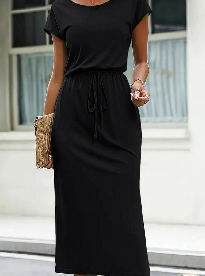 AnasayfaTüm ÜrünlerElbiseKısa Kollu Bisiklet Yaka Belden Kuşaklı Yandan Yırtmaçlı Maksi Elbise