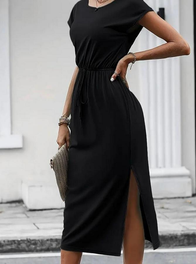 Kadın Kısa Kollu Bisiklet Yaka Belden Kuşaklı Yandan Yırtmaçlı Maksi Elbise