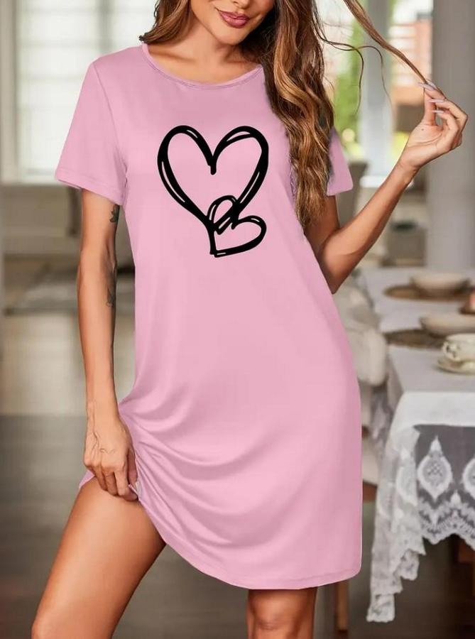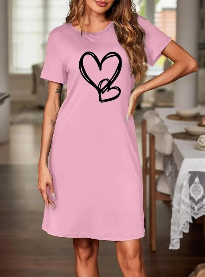 Kadın Kısa Kollu Bisiklet Yaka Kalp Desenli Viskon Elbise