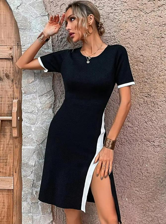 AnasayfaTüm ÜrünlerElbiseKısa Kollu Bisiklet Yaka Yandan Yırtmaçlı Renkli Şerit Detay Janjan Krep Elbise