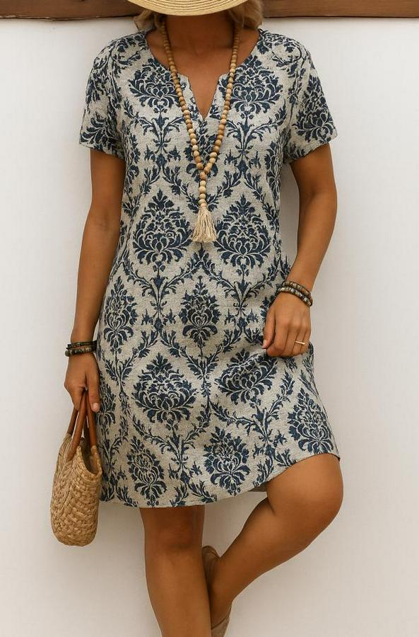Kadın Kısa Kollu çentik Yaka çiçek Desenli Keten Elbise