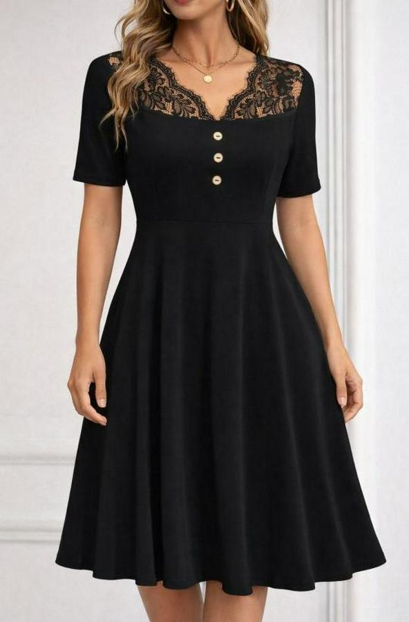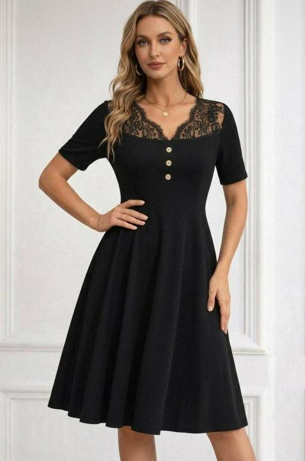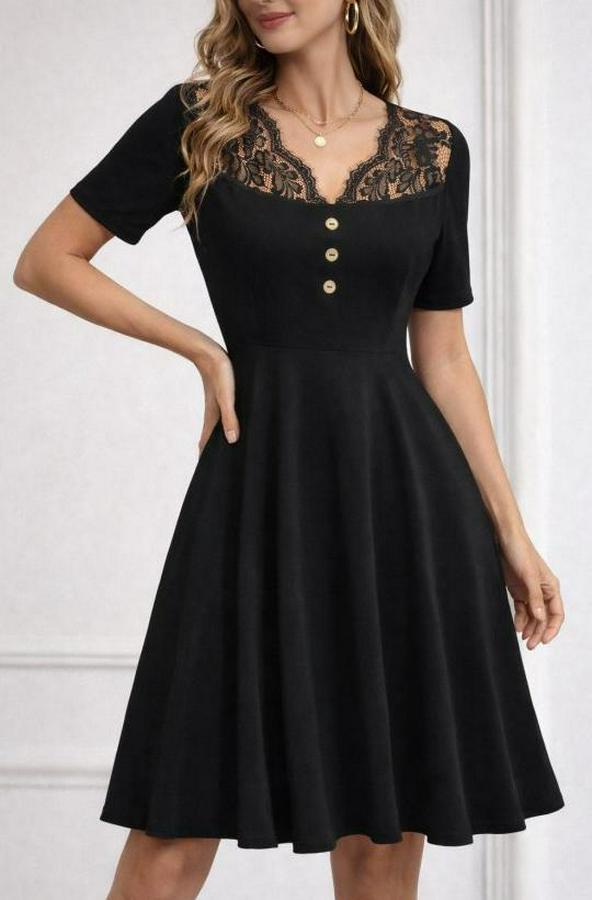 AnasayfaTüm ÜrünlerElbiseKısa Kollu Dantel V Yakalı Düğmeli Kısa Janjan Krep Elbise