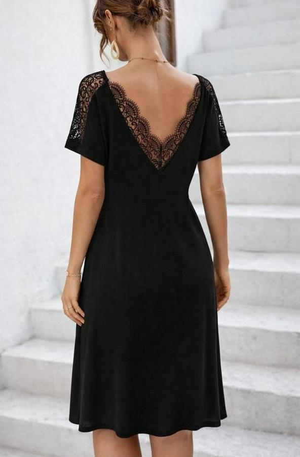Kadın Kısa Kollu Dantel V Yakalı Midi Viskon Elbise
