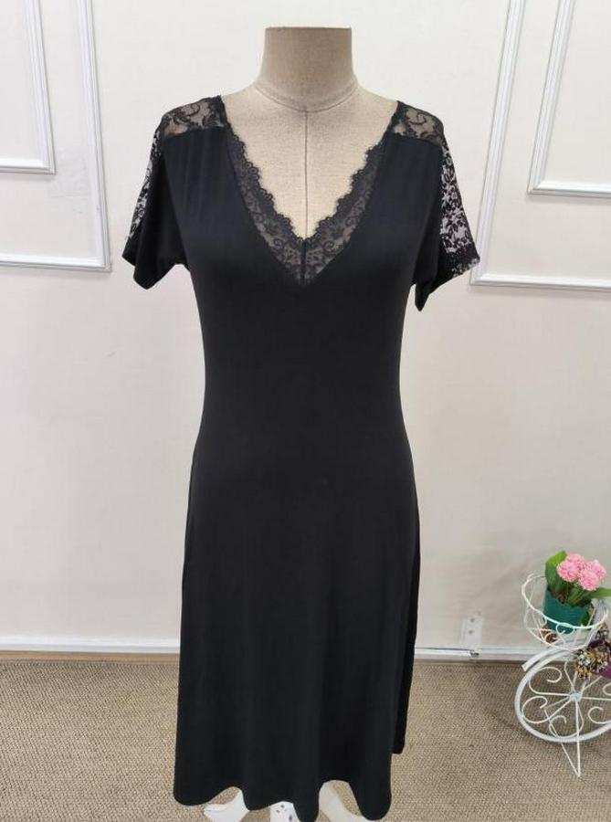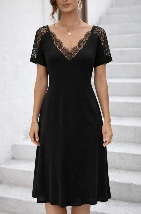 Kısa Kollu Dantel V Yakalı Midi Viskon Elbise