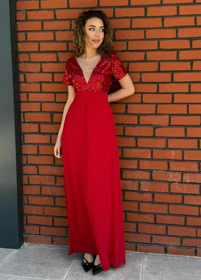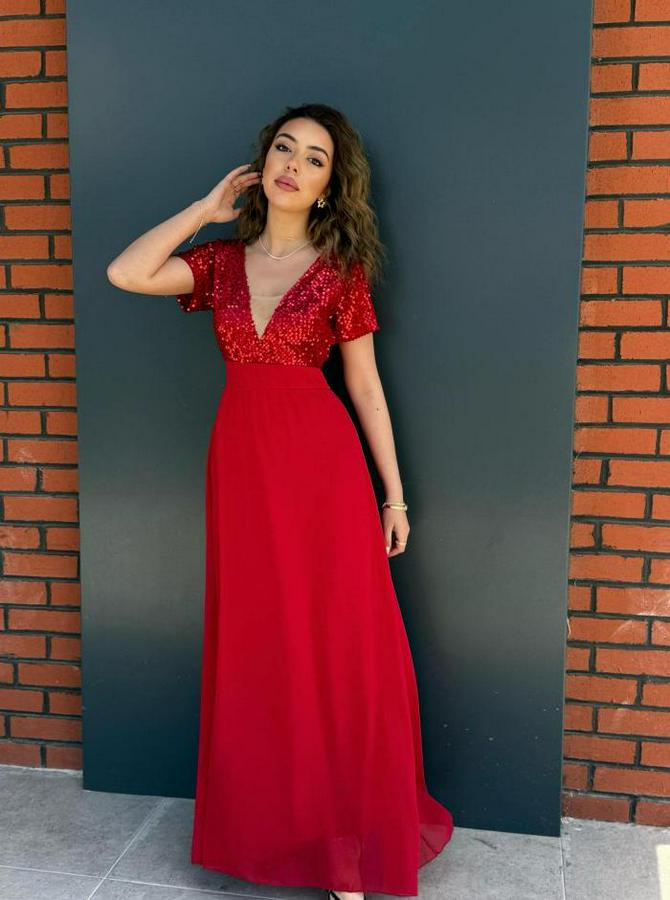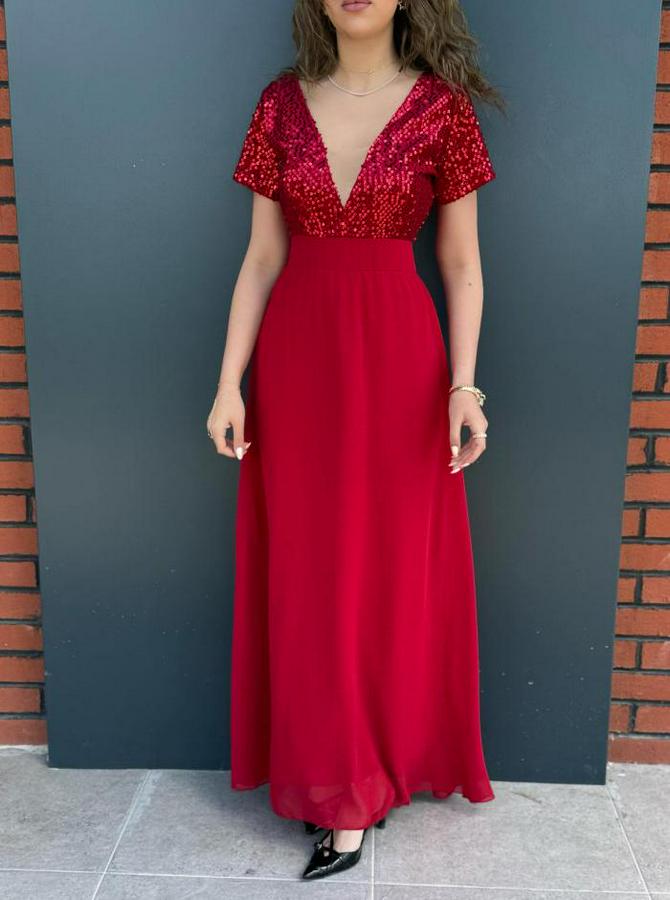 Kadın Kısa Kollu Derin V Yakalı A Kesim Pulpayet Detaylı şifon Nedime Elbisesi