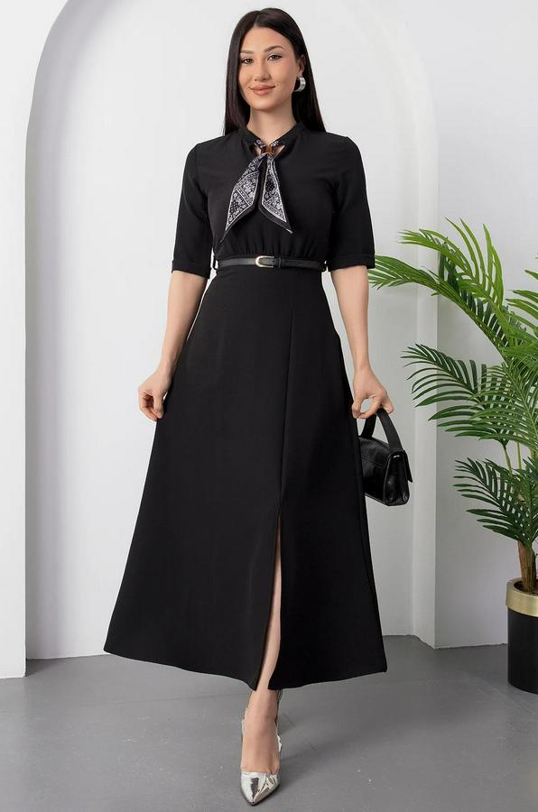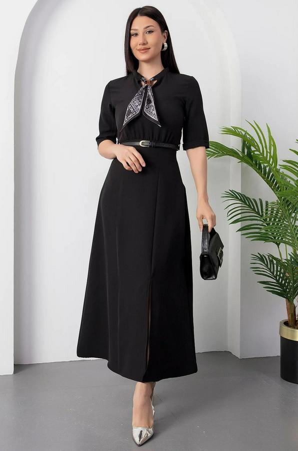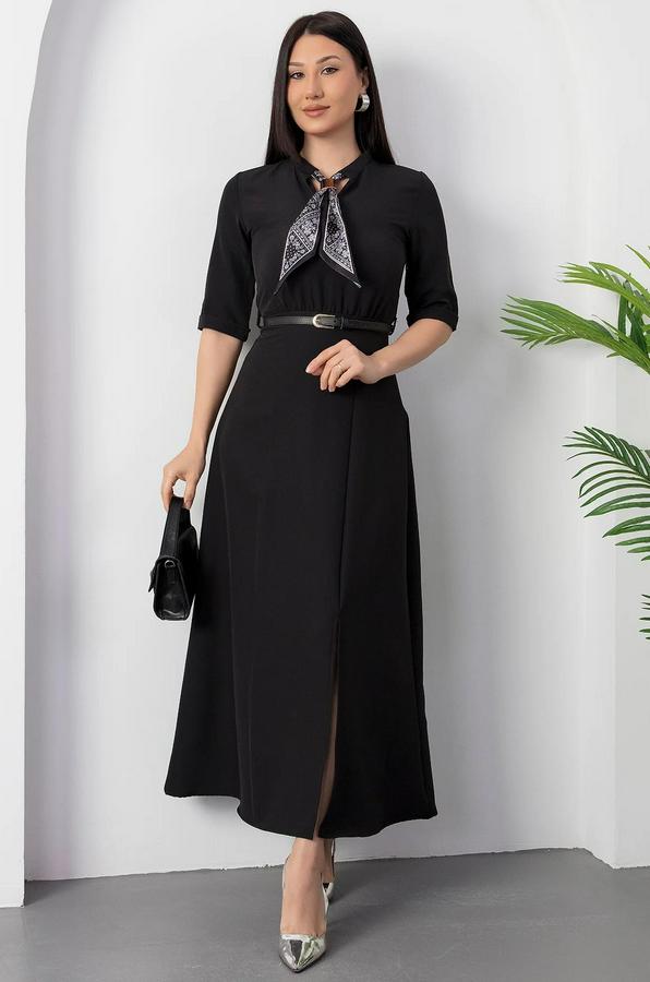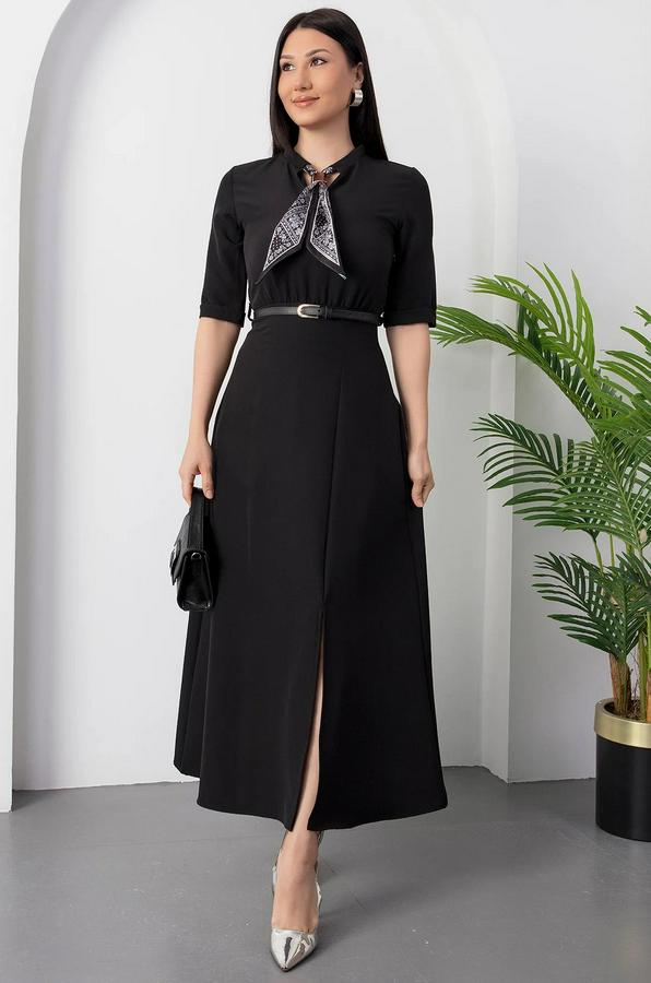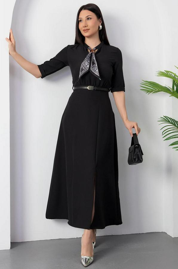 Kısa Kollu Fular Ve Kemer Detay Önden Yırtmaçlı Maxi Boy Elbise