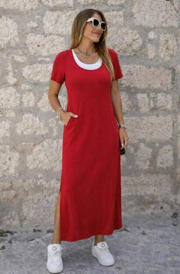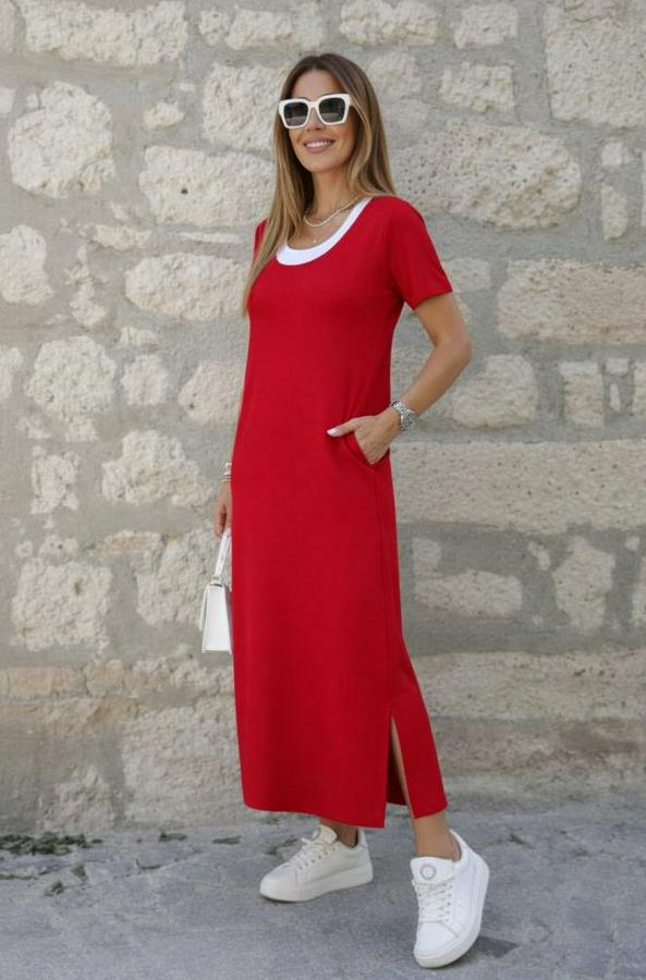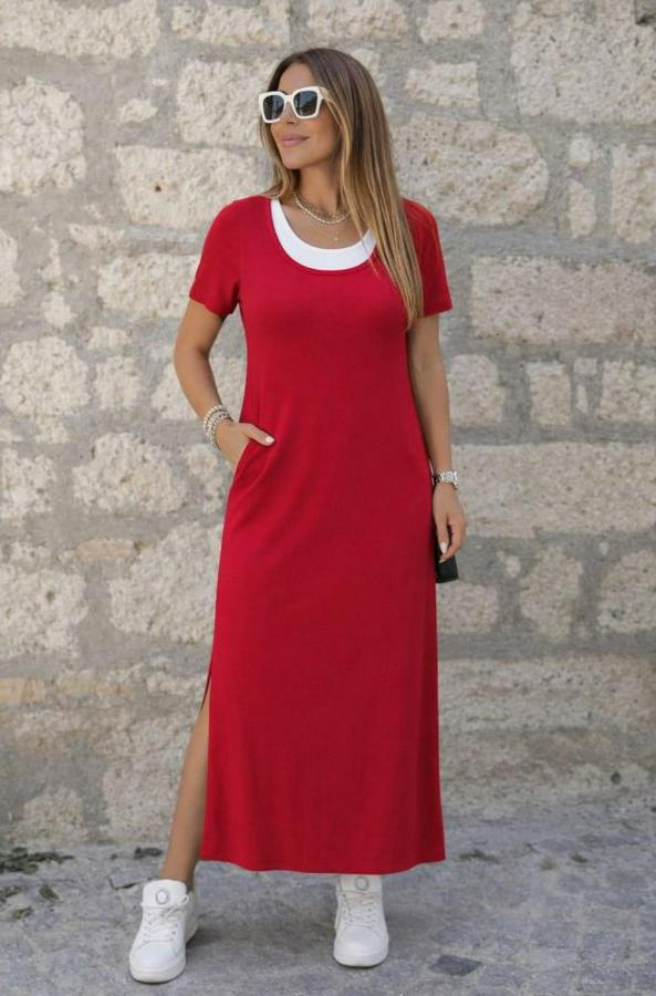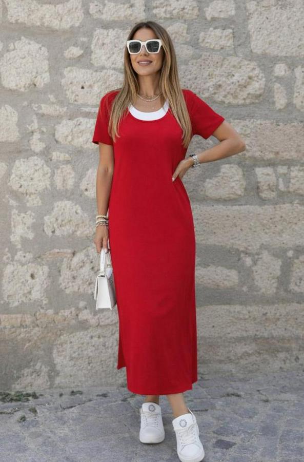 AnasayfaTüm ÜrünlerElbiseKısa Kollu Içi Atlet Görünümlü Yandan Yırtmaçlı Uzun Viskon Elbise