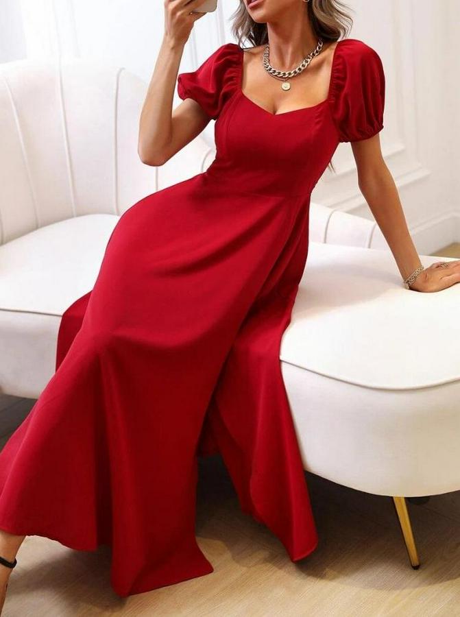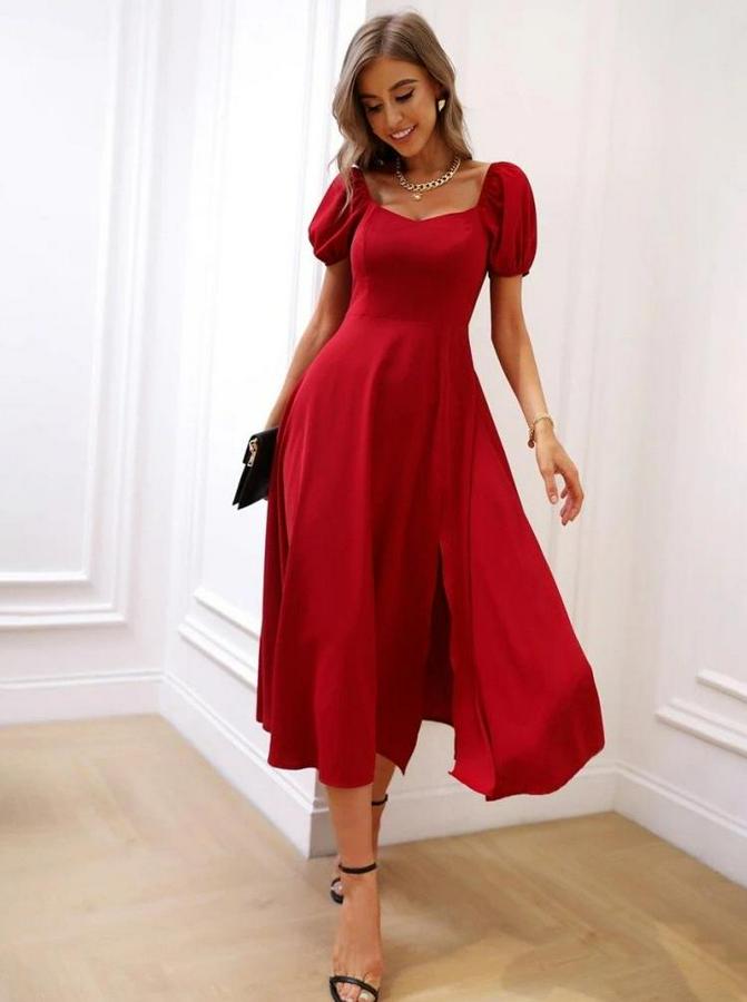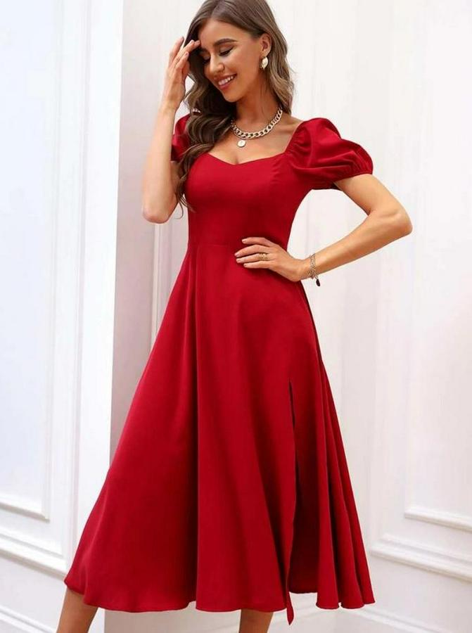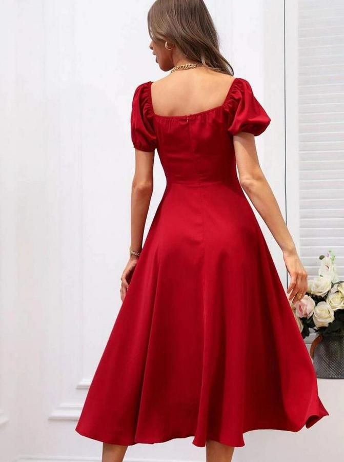 AnasayfaTüm ÜrünlerElbiseKısa Kollu Kare Yakalı Yırtmaçlı Midi Janjan Krep Elbise