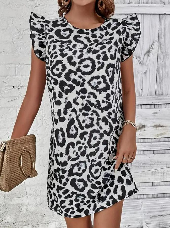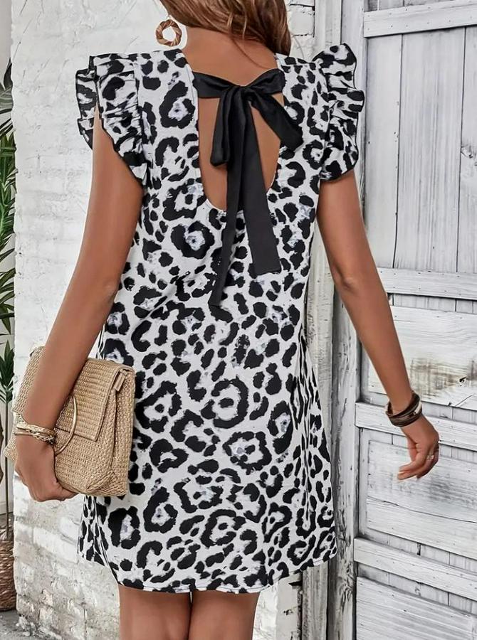 Kısa Kollu Kolları Fırfır Detay Arkası Bağlamalı Leopar Desen Kolsuz Mini Mikro Elbise