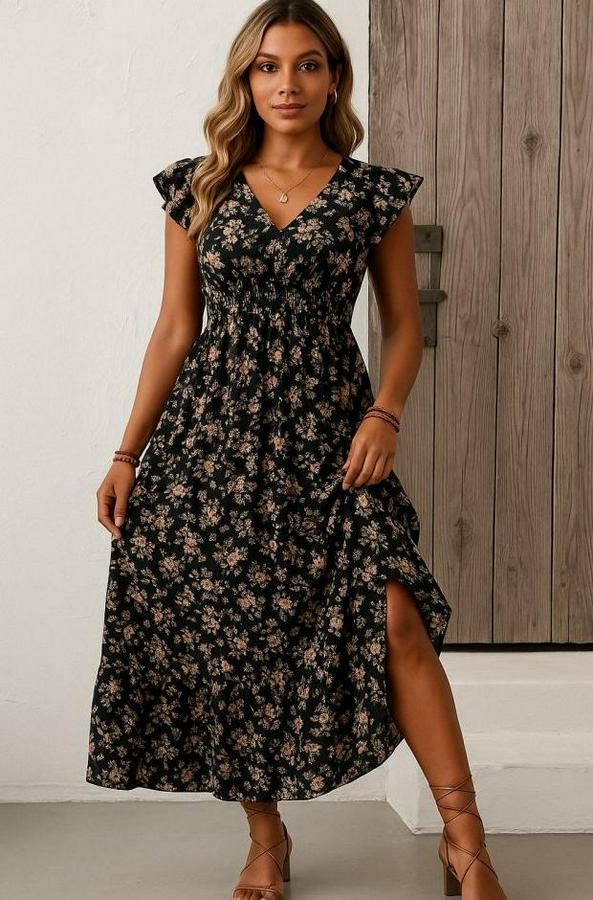 Kısa Kollu Kruvaze Yaka Beli Lastikli Çiçek Desenli Elbise