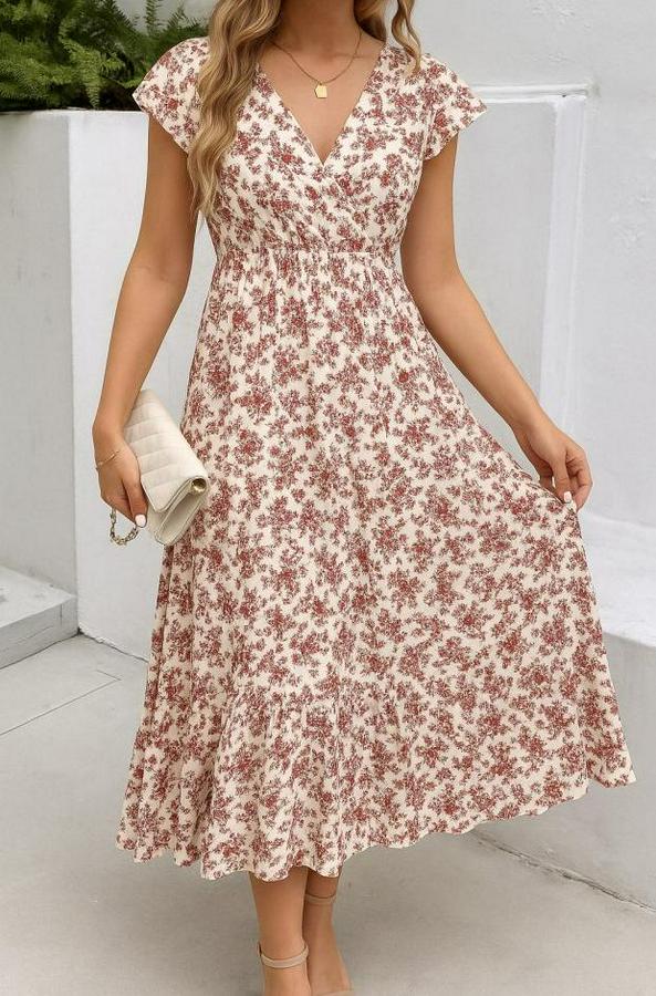 Kadın Kısa Kollu Kruvaze Yaka Beli Lastikli çiçek Desenli Elbise