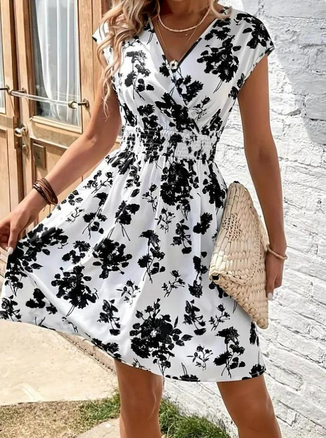 Kısa Kollu Kruvaze Yakalı Çiçekli Desenli Süprem Elbise
