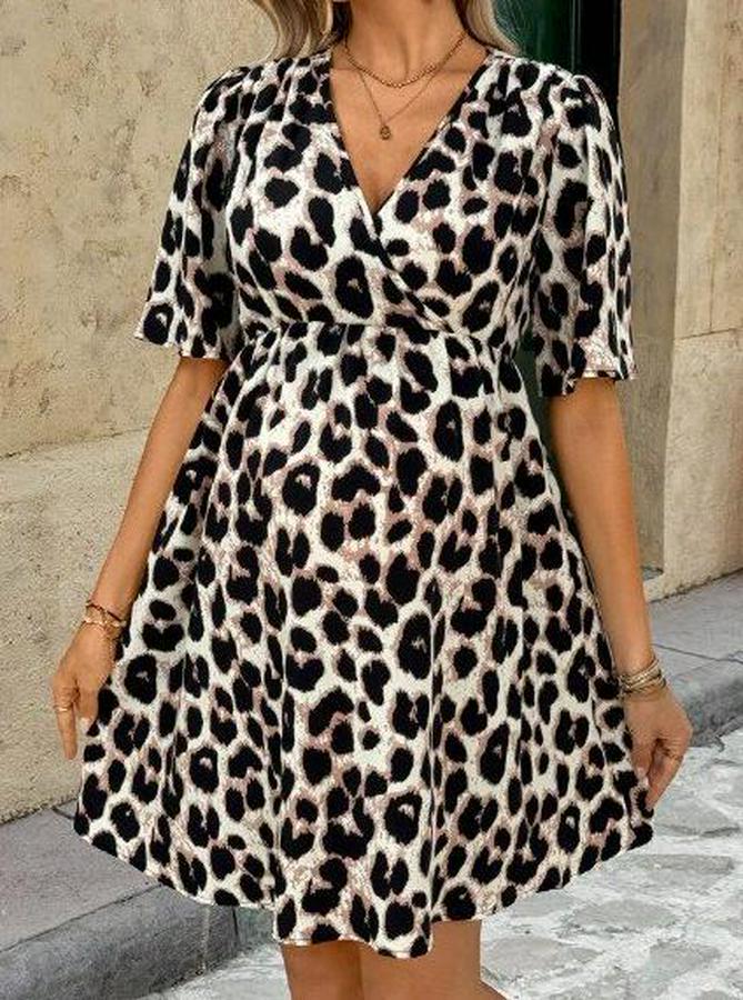 Kısa Kollu Kruvaze Yakalı Leopar Desenli Mini Süprem Elbise