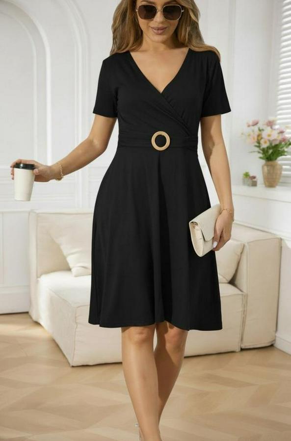 Kısa Kollu Kruvaze Yakalı Önden Toka Detaylı Kısa Viskon Elbise