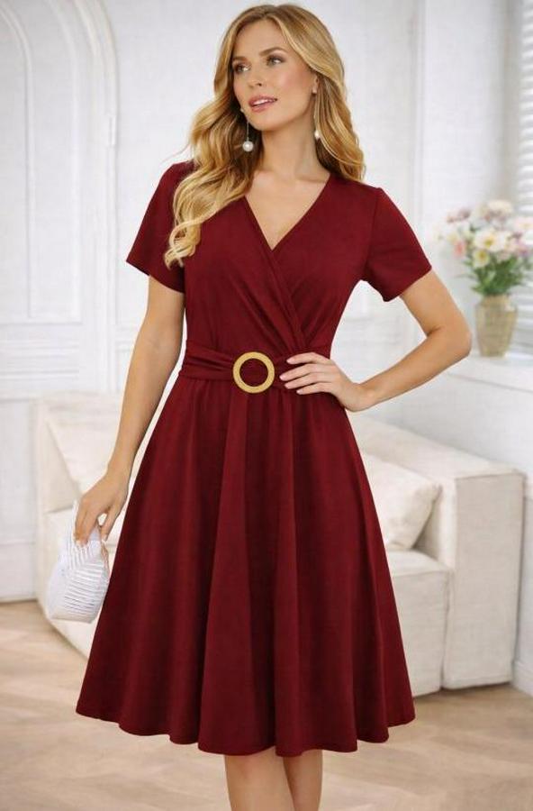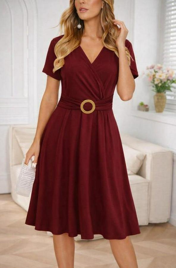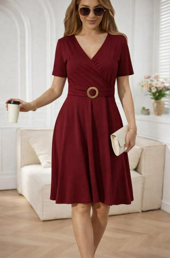 Kısa Kollu Kruvaze Yakalı Önden Toka Detaylı Kısa Viskon Elbise