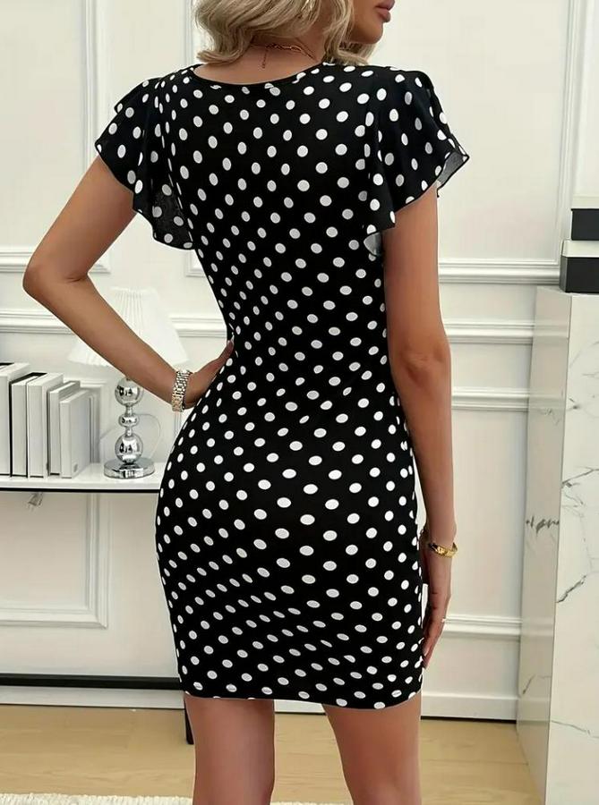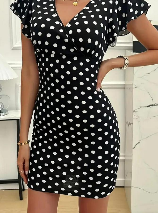 Kısa Kollu Kruvaze Yakalı Örme Puantiyeli Krep Elbise