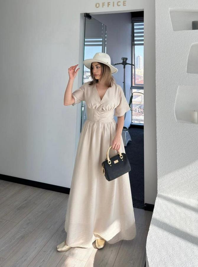 Kısa Kollu Uzun Elbise - Kırık Beyaz