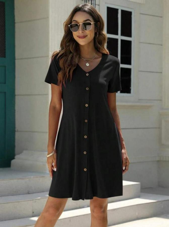 AnasayfaTüm ÜrünlerElbiseKısa Kollu V Yaka Önü Düğmeli Viskon Elbise