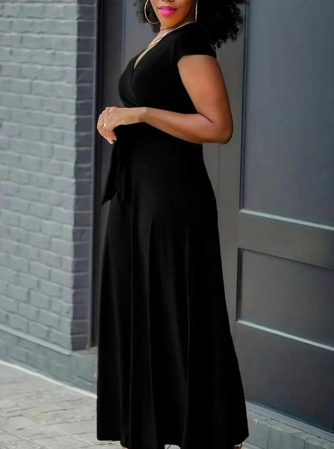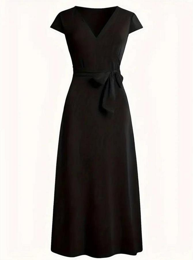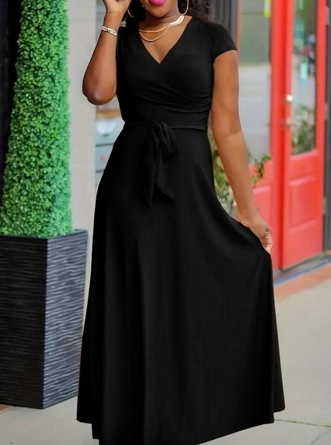 Kısa Kollu V Yakalı Belden Kuşaklı Maksi Boy Viskon Elbise