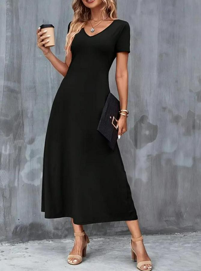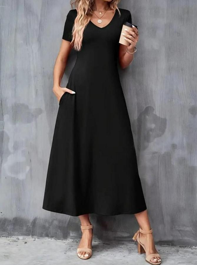 Kısa Kollu V Yakalı Cepli Viskon Elbise