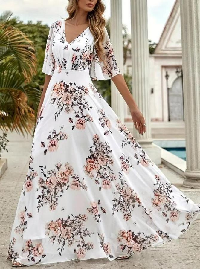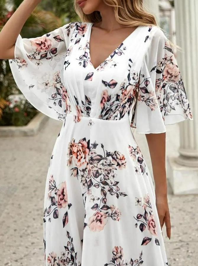 Kısa Kollu V Yakalı Çiçek Desenli Süprem Elbise