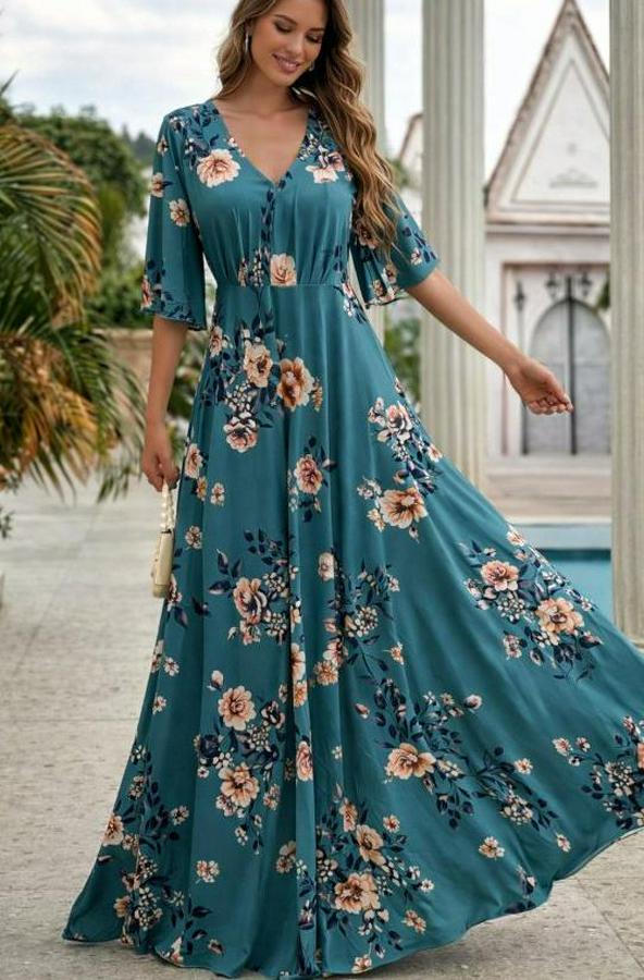 Kadın Kısa Kollu V Yakalı Desenli Süprem Elbise