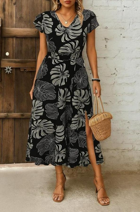 Kısa Kollu V Yakalı Desenli Yandan Yırtmaçlı Süprem Elbise