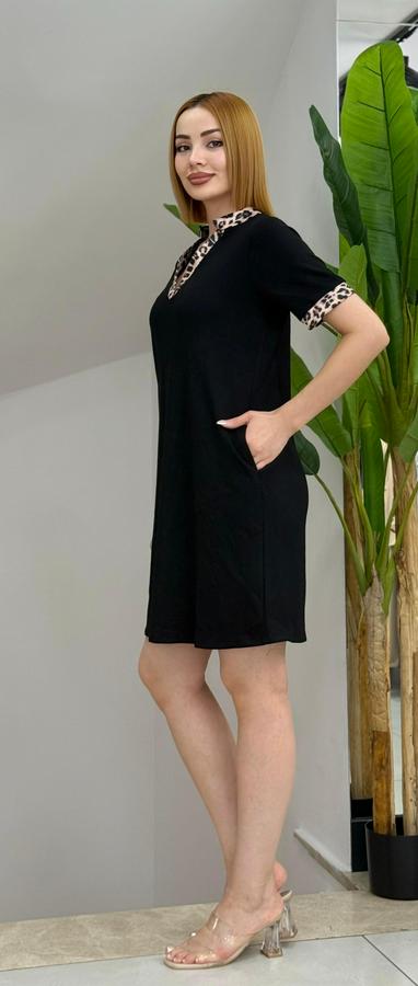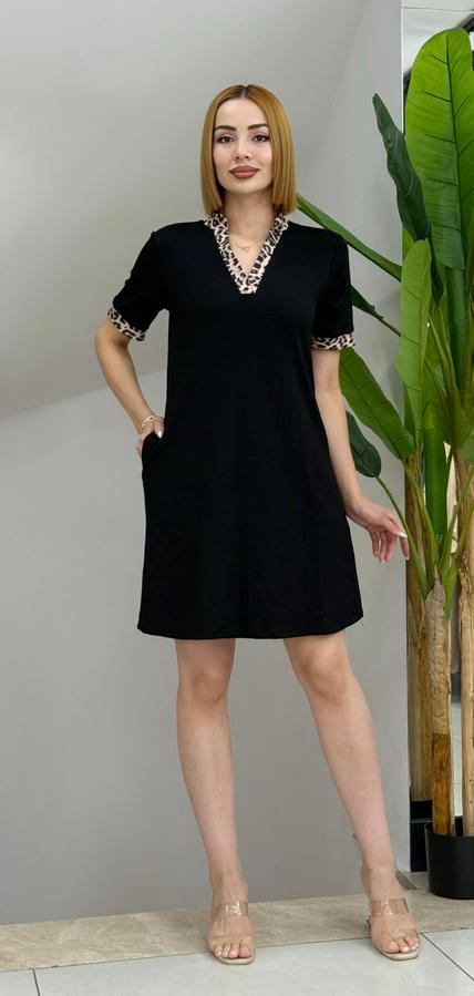 Kısa Kollu V Yakalı Leopar Desen Detaylı Modal Elbise
