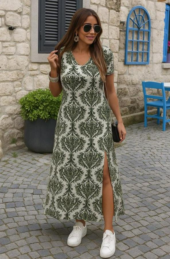 Kısa Kollu V Yakalı Maksi Boy Viskon Elbise