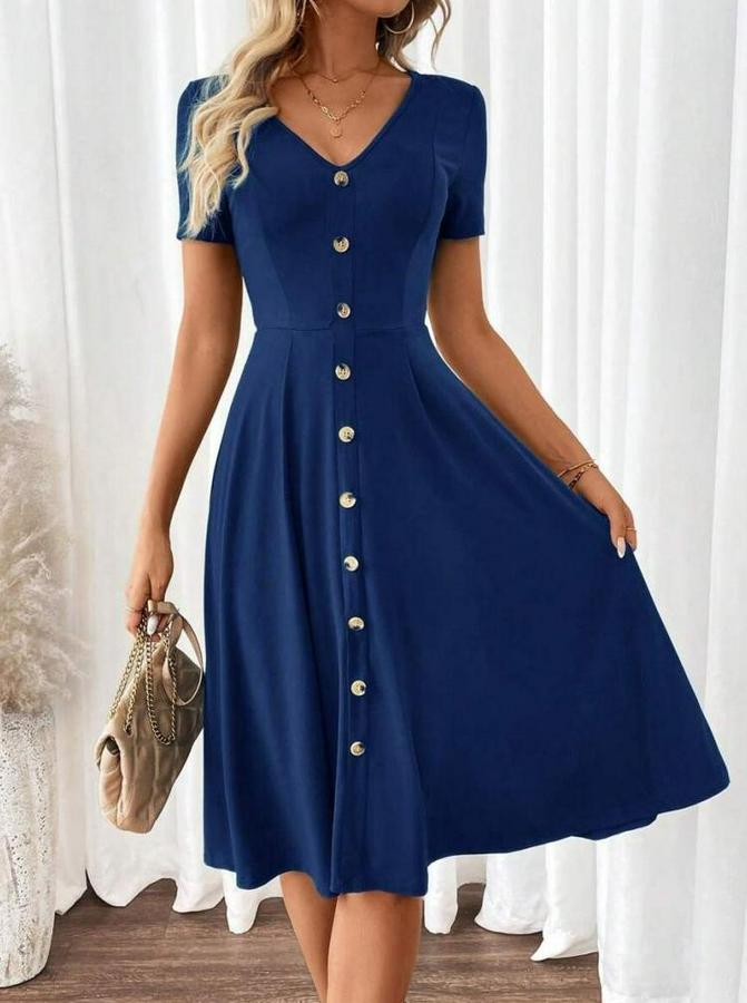 Kısa Kollu V Yakalı Önden Düğmeli A Kesim Dokuma Elbise